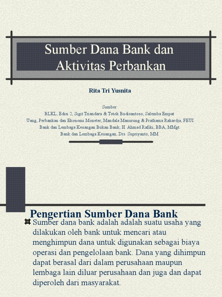 Bagi bank pengelola sumber dana dari masyarakat luas, terutama dalam bentuk simpanan giro, tabungan dan deposito sangatlah penting. Blkl, edisi 2, sigit triandaru & totok budisantoso, salemba empat uang, perbankan dan ekonomi moneter, mandala manurung & prathama rahardja, feui bank dan lembaga keuangan bukan bank, h. Pengertian sumber dana bank sumber dana bank adalah adalah suatu usaha yang dilakukan oleh bank untuk mencari atau menghimpun dana untuk digunakan sebagai biaya operasi dan pengelolaan bank.
